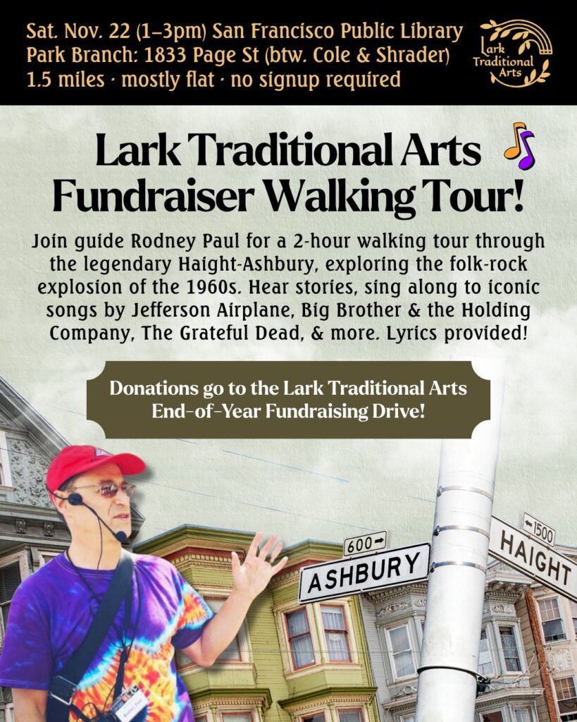Join the Lark Traditional Arts Fundraiser Walking Tour! Rodney Paul will lead us through San Francisco’s Haight-Ashbury neighborhood on Saturday, November 22, (1–3pm). No signup needed. Just show up!