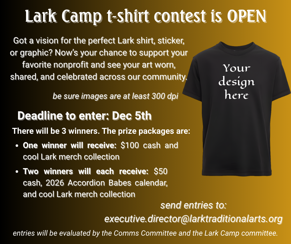 – Two winners will each receive: $50 cash, 2026 Accordion Babes calendar, and cool Lark merch collection
